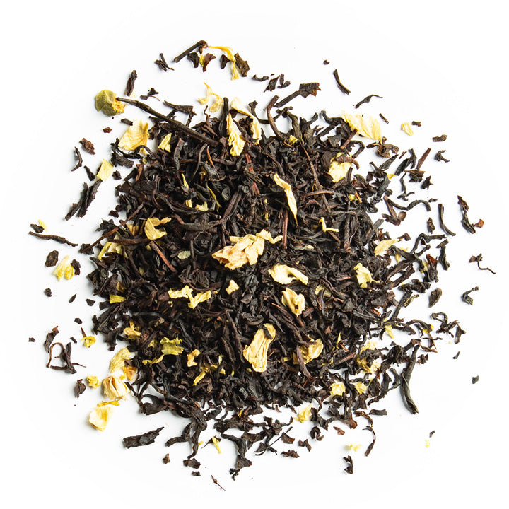 Schwarztee mit weissen Hibiskusblüten, aromatisiert mit Bergamotte-Jasmin-Geschmack.
