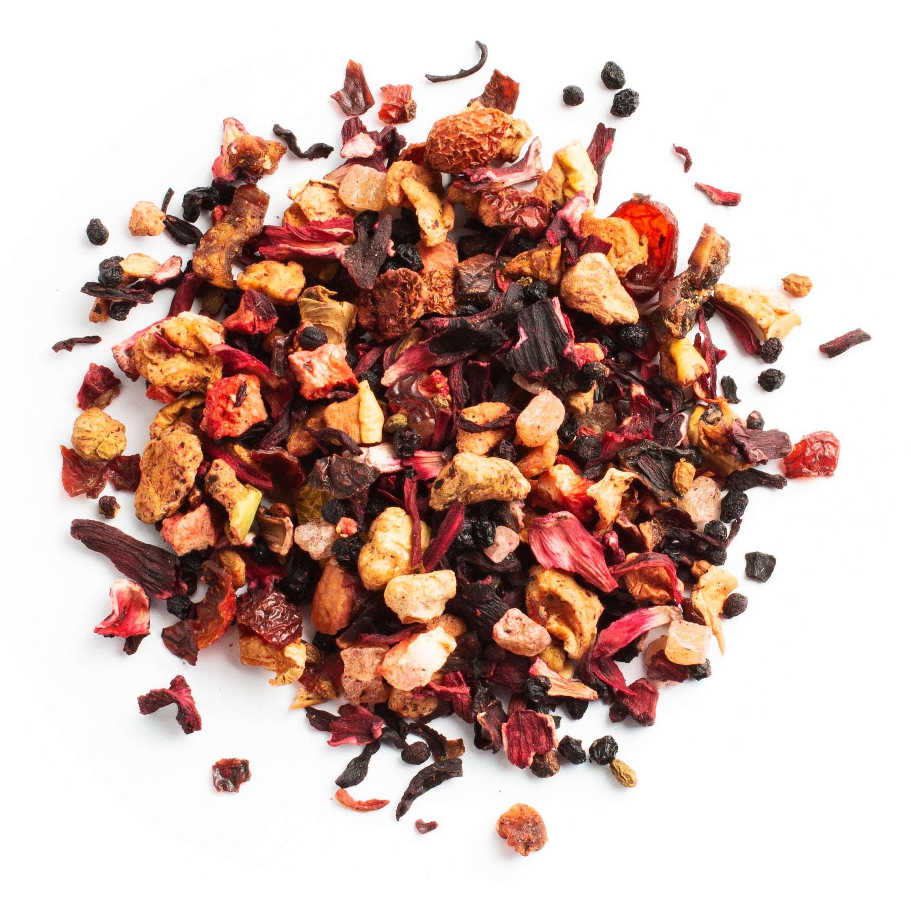 Hibiskusblüten, Apfelstücke, Fliederbeeren, Hagebuttenschalen, Ananaswürfel (Ananas, Zucker), Aroma, gefr.-getr. Erdbeerstücke (2%)| Energie 25 KJ /6 kcal