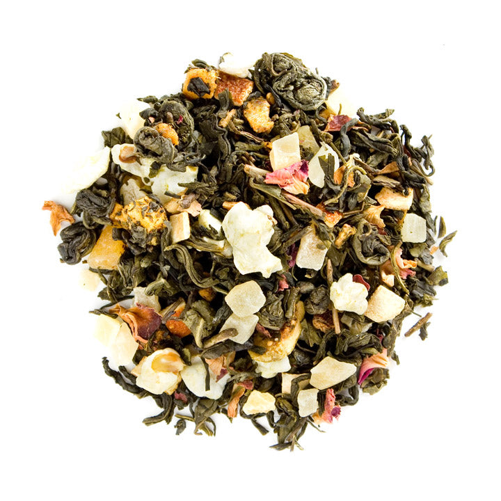 Grüner Tee China (Chun Mee, Wu Lu, Gunpowder), kandierte Ananasstücke (Ananas, Zucker), kandierte Papayastücke (Papaya, Zucker), natürliches Aroma, kandierte Mangostücke 5% (Mango, Zucker), Orangenschalen, Maracujastücke 2% (Apfelpüree-Konzentrat, Maracujakonzentrat, Antioxidationsmittel: Ascorbinsäure), Popcorn (Mais, Rapsöl), Feigenscheiben, Marillenstücke, Rosenblütenblätter | Energie 9 KJ / 2 kcal