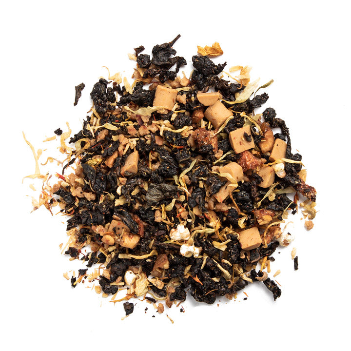 Halbfermentierter Tee, Krokantstücke (Zucker, HASELNÜSSE), Karamellstücke (12%) (Zucker, Kakaobutter, Karamellpulver [MAGERMILCHPULVER, MOLKENPULVER, Zucker, BUTTER, natürliches Aroma], VOLLMILCHPULVER, Emulgator: Sonnenblumenlecithin, Paprikaextrakt), Aroma, Kokosraspeln, Apfelstücke, Meersalz (3%), Ringelblumenblüten, Popreis, Saflorblüten | Durchschnittliche Nährwerte je 100ml Fertiggetränk*: