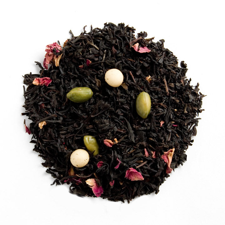 Schwarzer Tee (90%), PISTAZIEN (6%), Aroma, gefr.-getr. Marzipantröpfchen (MANDELN, Zucker, Feuchthaltemittel: Invertase), Rosenblüten | Energie 12 kJ / 3 kcal