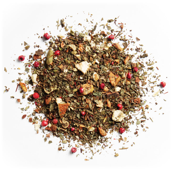 Das perfekte Dreier-Gespann. Ergänzt durch Apfelstücke, Kardamom und rosa Pfeffer wird die Kombi perfekt. Tulsi – in Sanskrit "die Unvergleichliche" – gilt in Indien als Königin unter den Kräutern und darf in keinem Haus oder Garten fehlen. Tulsikraut wird wegen seines kräftig aromatischen Geschmacks und seiner besonderen Wirkung geschätzt.