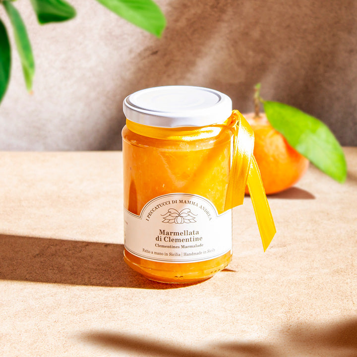 Clementinenmarmelade mit feingeschnittener Schale. Hergestellt aus Sizilianischen Zitrusfrüchten - innerhalb von 24 Stunden nach der Ernte - mit der alleinigen Zugabe von Zucker und ohne Zusatz von Konservierungsmitteln, Säuerungsmitteln oder Pektin. Das Obst Siziliens ist der wahre Schatz der Insel, ein Augen- und Gaumenschmaus.