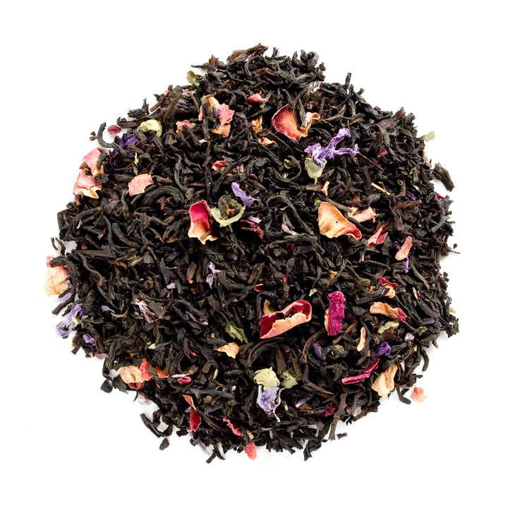 Zutaten Schwarzer Tee, Aromen, rote Rosenblütenblätter, Malvenblüten