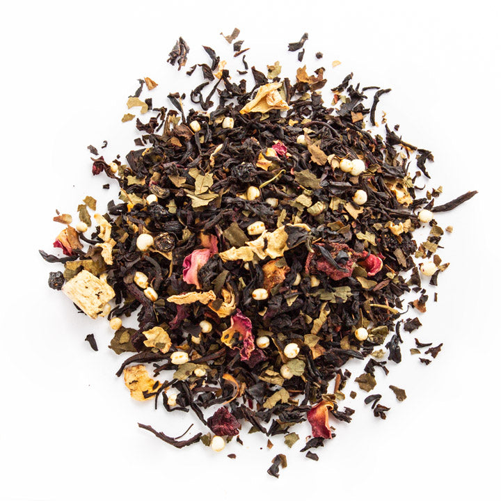 Zutaten Schwarzer Tee (68%), süße Brombeerblätter, Aroma, Hibiskusblüten, Rosenblütenblätter, Holunderbeeren, Rote Beetestücke, Erdbeerstücke (1,5%), Quinoa, Rhabarberstücke (1%)