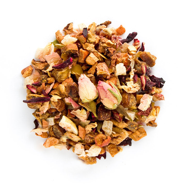Apfelstücke, Feigenstücke mit Trennmittel Reismehl (29%), Ananasstücke (Ananas, Zucker, Säuerungsmittel: Zitronensäure), Hibiskusblüten, Feigen (5%), MANDELN gehobelt, Aroma, Rote Beete Stücke, Rosenknospen, Rosenblütenblätter, Hibiskus-Extrakt (Hibiskus, Maltodextrin) | Energie 16 kJ / 4 kcal