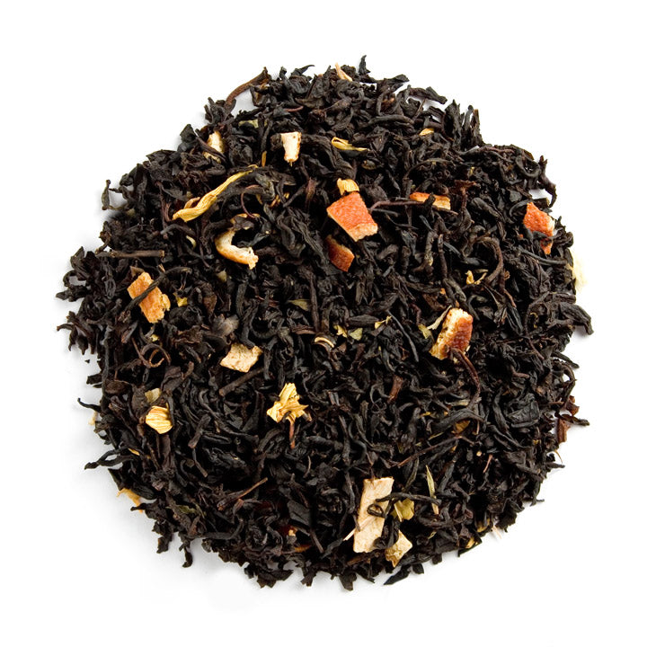 Schwarzteemischung mit Kräutern und Fruchtstücken, aromatisiert mit Orange-Geschmack.
