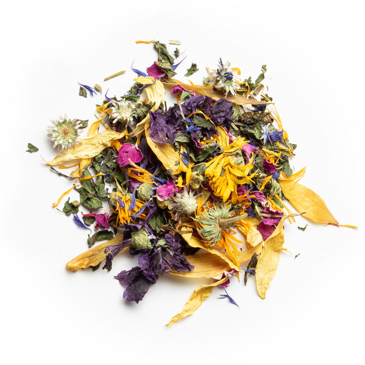 Zutaten Krauseminze*, Schafgarbe*, Kamille*, Ringelblumenblüten*, Rosenblüten*, Sonnenblumenblüten*, Lavendel*, Kornblumen*, Malven*, Goldmelisse* *aus kontrolliert biologischem Anbau
