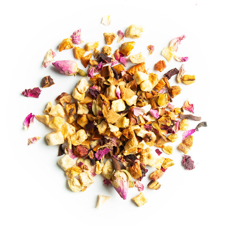 Zutaten Apfelstücke, Hibiskusblüten, Rosenblütenblätter (5%), Rosenknospen (2%), Aroma