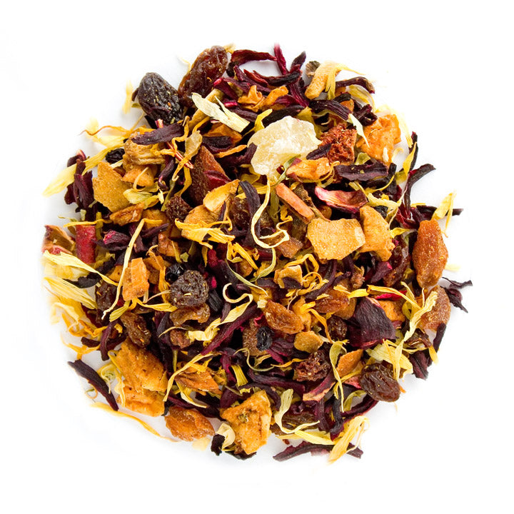Hibiskusblüten, Apfelstücke, Weinbeeren, Marillenstücke 10% (Marillen, Reismehl), kandierte Ananasstücke (Ananas, Zucker), Holunderbeeren, Aroma, Pfirsichstücke 3% (Pfirsich, Reismehl), Zitronenschalen, Ringelblumenblüten | Energie 13 KJ / 3 kcal