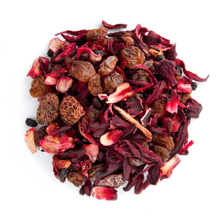 Zutaten Hibiskusblüten, Weinbeeren, Holunderbeeren, Aroma, Erdbeerstücke, Himbeeren