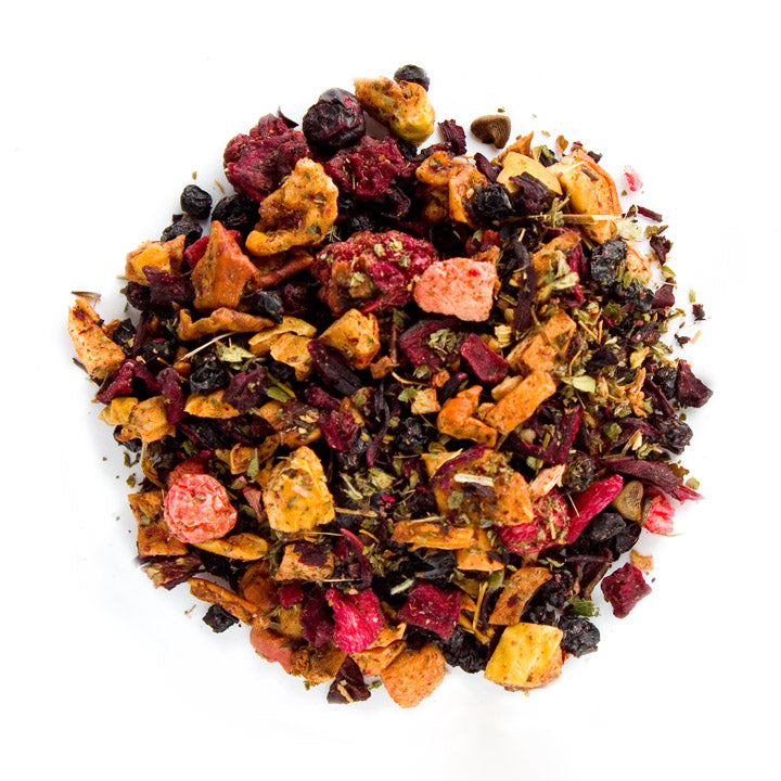 Zutaten Apfelstücke, Holunderbeeren, Rote Beetestücke, Hibiskusblüten, Aroma, rote und schwarze Johannisbeeren, Erdbeerstücke (1%), Rhabarberstücke (1%), Brombeeren, Himbeeren