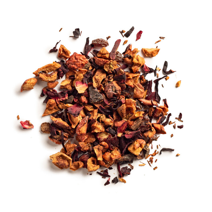 Zutaten Apfelstücke, Hibiskusblüten, Weinbeeren, Rooibos, Hagebuttenschalen, Zimtrinde (5%), Aroma, Pflaumenstücke (Pflaumen, Reismehl) (4%)