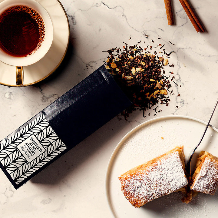 Schwarztee mit Fruchtstücken, aromatisiert, mit Apfel-Mandel-Geschmack. Fruchtige Äpfel, nussige Mandeln und saftige Weinbeeren - die Zutaten für einen typischen Apfelstrudel ergeben diesen aromatischen Schwarztee mit Wiener Charme, der die Mehlspeistradition der Stadt perfekt zelebriert.