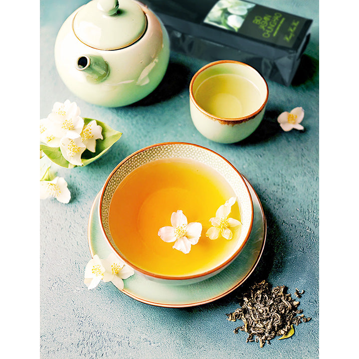 Grüntee, natürlich aromatisiert. Jasmintee wird schon seit mehr als 1000 Jahren aus der Vermischung von grünem Tee mit den frischen, weißen Jasminblüten hergestellt. Während der Verarbeitung werden dem grünen Tee die frischen Jasminblüten in einem mehrstufigen Verfahren zugesetzt, wobei sie ihren angenehmen Duft auf den grünen Tee übertragen. Anschließend werden die Jasminblüten wieder aus dem Tee herausgesammelt. Spitzenqualität mit feinem Jasmingeschmack.