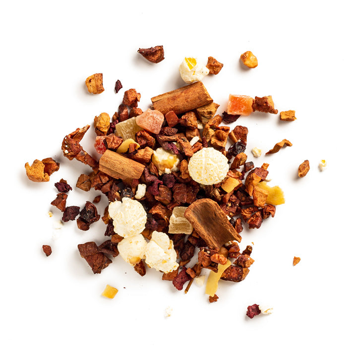 Apfelstücke (Apfel, Säuerungsmittel: Zitronensäure), kandierte Ananasstücke (Ananas, Zucker), kandierte Papayastücke (Papaya, Zucker), Rote Beetestücke, Zimtstangen, Aroma, Weinbeeren, Kokoschips (Kokosnuss, Zucker), gebrannte MANDELN 2% (MANDELN, karamellisierter Zucker), Popcorn (Mais, Rapsöl) | Durchschnittliche Nährwerte je 100ml Fertiggetränk*: Energie 16 KJ / 4 kcal Fett <0,5g davon gesättigte Fettsäuren <0,1g Kohlenhydrate 0,9g davon Zucker 0,9g Eiweiß <0,5g Salz <0,01g *bei Aufguß von 2g Tee mit 100ml kochendem Wasser und einer Ziehzeit von 5 min.